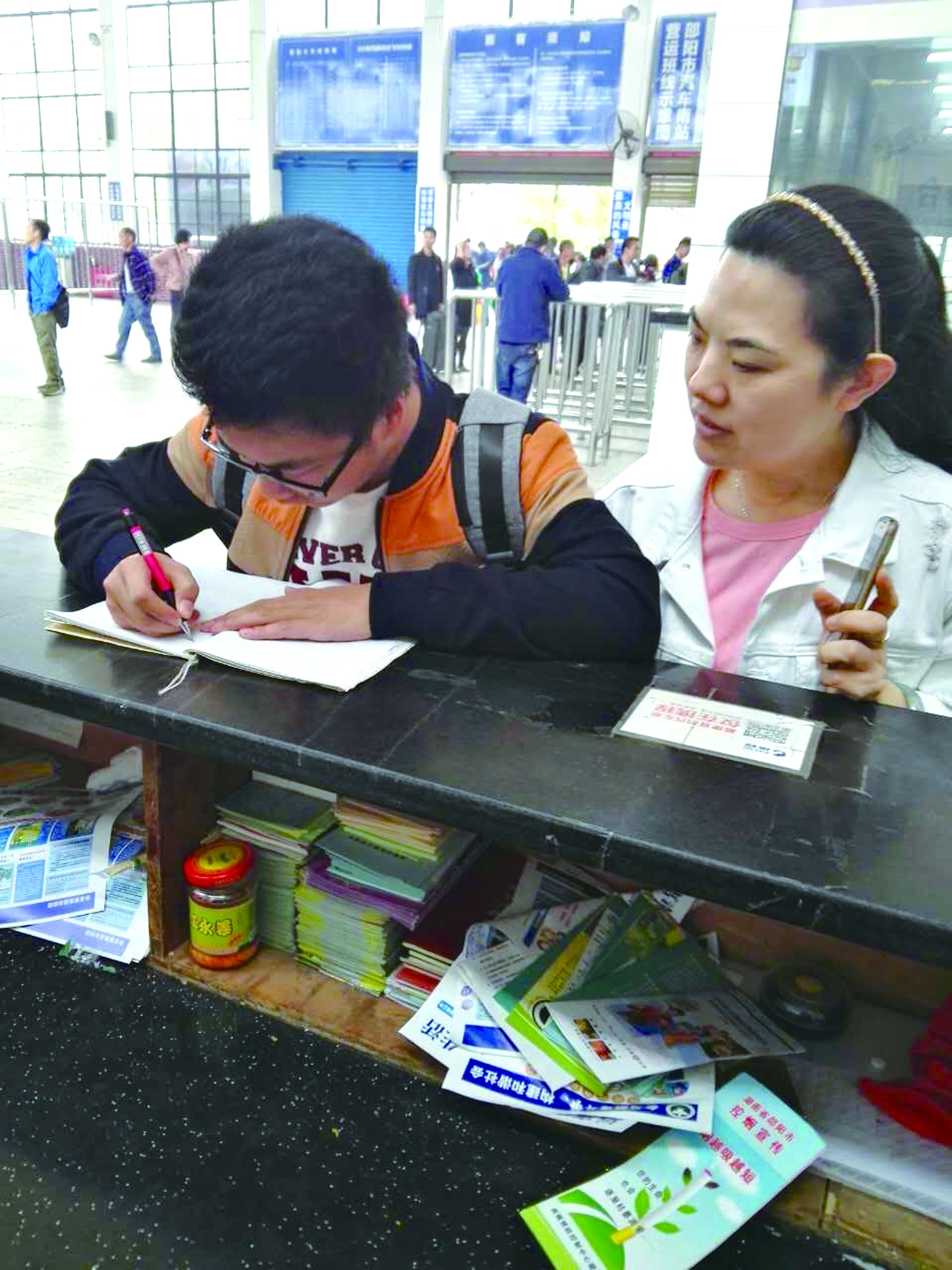 (徐容芳報(bào)道) 4月6日上午,市汽車南站的客流高峰還在持續(xù),售票廳買票上車的旅客絡(luò)繹不絕,正在安檢機(jī)前值班的員工周擁軍有條不紊的指揮著購(gòu)票進(jìn)站的旅客把大包小包的行李過(guò)機(jī)安檢。11時(shí)許,旅客漸漸稀少,周擁軍拿起桌上的杯子想喝口水,這時(shí)他卻無(wú)意中發(fā)現(xiàn)安檢機(jī)傳送帶旁有一個(gè)背包在地上。于是,周擁軍撿起趕緊喊剛過(guò)去的幾個(gè)旅客,但都說(shuō)不是他們的,周擁軍趕緊將包拿到該站總服務(wù)臺(tái),廣播員連續(xù)廣播失物認(rèn)領(lǐng)七八次仍沒(méi)人領(lǐng)取。12時(shí)左右,一學(xué)生模樣的大男孩匆匆來(lái)到服務(wù)臺(tái)認(rèn)領(lǐng)自己的背包,在確認(rèn)旅客身份后,值班副站長(zhǎng)張紅文把包交還給了此男孩,其非常感激連說(shuō)謝謝,并從包里拿出紙和筆來(lái),伏在服務(wù)總臺(tái)匆匆寫了一封感謝信,才登上了發(fā)往長(zhǎng)沙西站的班車。